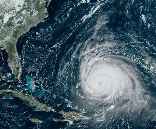 Image description: Satellite image of Hurricane Lee, a large storm with a spiral of puffy white clouds, taken on September 12, 2023. Below is the blue water of the Atlantic Ocean. To the left, the green land of the southeast U.S., Florida, and Cuba are visible.
